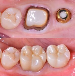 A superfície do dente está lisa, totalmente polida, pronto para receber a coroa (dente) em porcelana pura. A coroa encaixa perfeitamente na base, sem brechas, com as margens bem seladas. É exatamente esse nível de detalhe que te permite ter um resultado que terá durabilidade, além de ter o dente lindo de volta. Olha que dentes lindos!